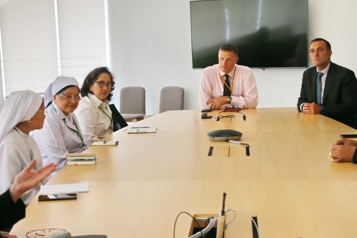 คุณพ่อเดชา อาภรณ์รัตน์ เลขาธิการสภาการศึกษาคาทอลิกฯ นำทีมผู้เข้าร่วมแลกเปลี่ยนเรียนรู้ สร้างความเข้าใจ / พัฒนาแนวปฏิบัติในเรื่อง Child Protection หรือ การปกป้องคุ้มครองนักเรียน โดยมี Mr.Chris Seal ผู้อำนวยการ และ Mr.Nick Loudon, Director of Child Protection ผู้ซึ่งเป็นเสมือนศูนย์รวมของความรู้จากการปฏิบัติจริงและยินดีแบ่งปันด้วยเต็มใจ